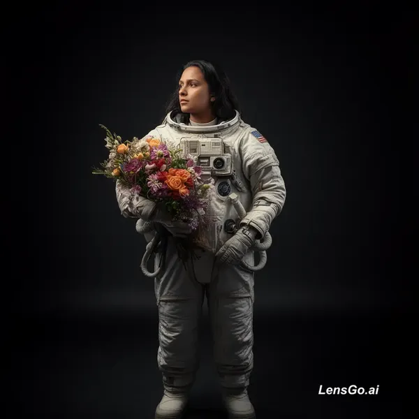 AI Image: Studio portrait of an astronaut holding flowers, dramatic lighting