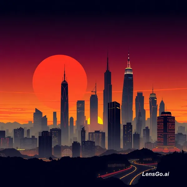 AI Image: Art deco poster of a futuristic city skyline at sunset