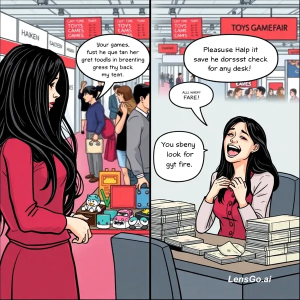 Hi can you help me create a humorous pic, comic style in 2 grids, first grid showing a beautiful woman, long black hair, is at a Toys and Games Fair, showing many booths as background, and this beautiful woman is elegantly greeting guests stopping by her booth, demonstrating her toys. The guests are nodding their heads and feel very satisfied. The second grid, please show this beautiful woman, look a bit tired, sitting in front of her desk, laughing her heart out, very happy and a bit funny, with stacks of cash on her desk and many checks on her desk too, showing she made a lot of money after the fair. Thanks.