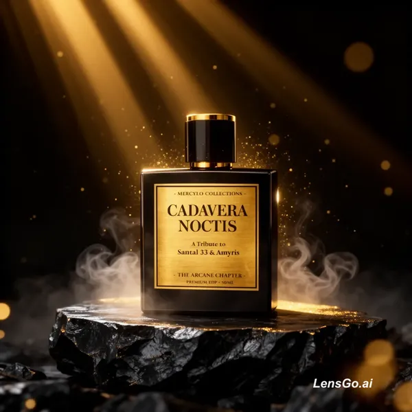 AI Image: Cinematic luxury perfume reveal trailer, 15 seconds. A sleek black and gold perfume bottle "CADAVERA
