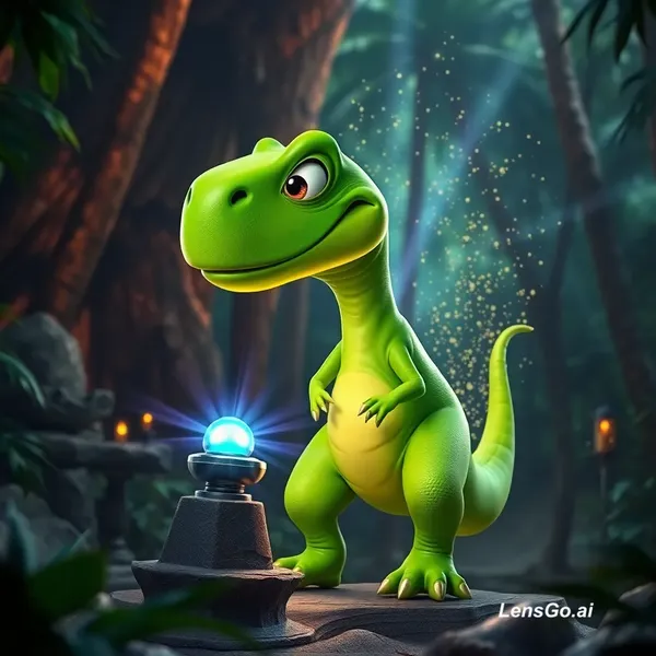π¬ SCENE 1 - The Shrinking Moment (Hook) Prompt: A funny-looking bright green cartoon T-Rex named Rex, with smooth vibrant green scales, lighter green belly, big round expressive eyes, slightly oversized head, tiny arms, thick tail, and a goofy playful face, a talkative and highly expressive character mid-speech, standing inside a dense jungle laboratory filled with mysterious glowing elements and ancient stone technology, Rex pressing a glowing futuristic button on a small stone pedestal, the button emitting intense neon blue and green light, magical energy explosion radiating outward, shockwave of light particles and energy rings expanding, Rex beginning to shrink rapidly with magical distortion effect, his face showing extreme shock and humor as if shouting, glowing particles swirling around him, jungle trees towering in the background, cinematic fog, volumetric light beams, motion blur, dramatic lighting, depth of field focusing on Rex's face, vibrant Pixar-style animation, ultra-detailed textures, whimsical and funny tone, Ultra-detailed 10K cinematic animation, Pixar-style 3D, volumetric lighting, depth of field, ultra-sharp focus, dramatic shadows, global illumination, highly detailed textures, soft cinematic glow, dynamic camera angles, shallow depth of field, expressive character, 8k-10k resolution, high contrast, cinematic storytelling, hyper-realistic environment, no text, no watermark