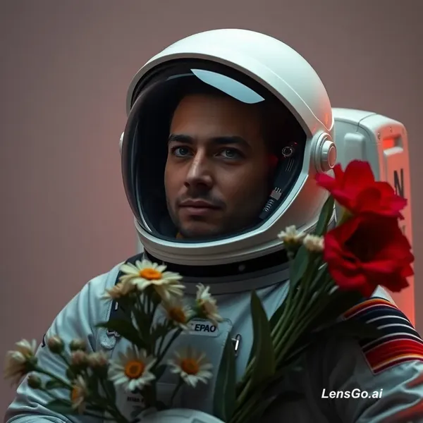 AI Image: Studio portrait of an astronaut holding flowers, dramatic lighting
