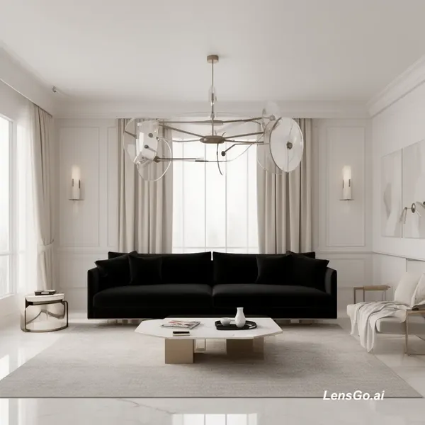 AI Image: place the chandelier in the interior, the interior is sophisticated, light, the sofa is black, 3D re