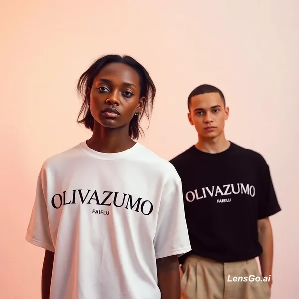 An advert for a luxury perfume brand, minimalist fashion editorial photoshoot, 2 models wearing t-shirt with bold "OLIVAZUMO" typography, Use Image of font attached clean style, one Asiatic female with boring face in the middle of the studio, pastel toned background with smooth gradient, soft shadows and high-end studio lighting, inspired by Balenciaga + Fear of God campaigns, fashion editorial lookbook aesthetic, ultra sharp focus, Canon EF 50mm F/1.4, 8k, shot for Vogue magazine, contemporary streetwear campaign.