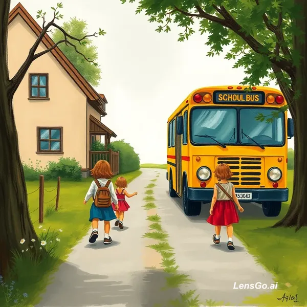 AI Image: ich brauche ein bild von einem schulbus und kindern, die von einem haus auf einem weg zum schulbus l