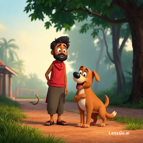 Prompt: Create a heartwarming emotional cartoon video of a simple village man named Raju living alone with his loyal dog Sheru. Raju is a kind poor man wearing simple clothes, living in a small village house. Sheru is a cute, fluffy, loyal brown dog who always stays beside him. Show peaceful village scenes, Raju walking to work with Sheru following him happily, both sharing a strong friendship and emotional bond. Then show a tense scene in a forest path during evening, Raju walking home, suddenly a snake appears on the road. Raju gets scared and steps back. Sheru starts barking loudly and bravely stands in front of Raju. The snake gets frightened and slithers away. Then show Raju kneeling down, hugging Sheru emotionally, smiling with tears in his eyes, and saying, “Tu sirf kutta nahi, mera saccha dost hai.” End with a warm sunset scene of Raju and Sheru walking home together. Style: 3D cartoon animation, emotional storytelling, cinematic lighting, expressive characters, Indian village background, soft dramatic music, cute dog animation, heart-touching mood, detailed facial expressions, smooth camera movement, family-friendly. 🎥 Short Prompt (Quick Use) Prompt: A heartwarming 3D cartoon video of an Indian village man named Raju and his loyal dog Sheru. They live together and share a strong bond. One evening while returning home through a forest path, a snake