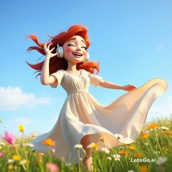 a joyful red-haired woman dancing freely in a flower-filled meadow under a clear blue sky, wearing flowing light dress and wireless headphones, her eyes closed, smiling, hair and fabric moving in the wind, dreamy natural light, soft focus, ethereal mood, wildflowers all around, sense of freedom and presence