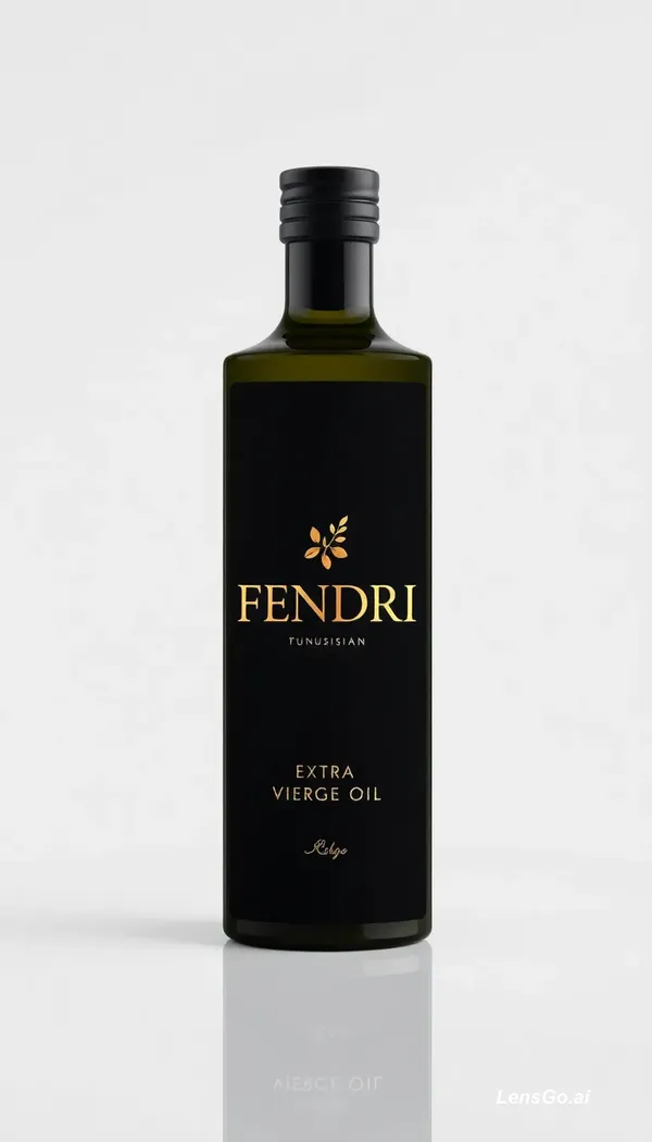 Luxury Tunisian olive oil label, black matte background with subtle texture, elegant gold foil typography "FENDRI", minimalist design, thin arabesque-inspired border, small olive branch icon, clean premium export style, "EXTRA VIERGE OIL", modern luxury food branding, high-end product render, white studio background, soft reflections