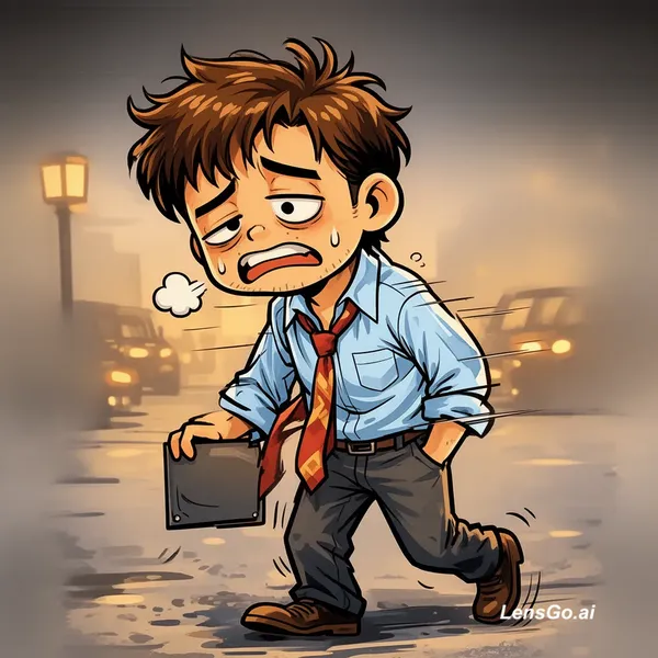 Replace only the main person in the video with a single cartoon character. The character should look like a tired office worker returning home after a long day, with messy hair, loosened tie, droopy eyes, and a funny exhausted expression. Keep all other people and background unchanged. Use a colorful comic style with smooth animation and expressive motion lines.