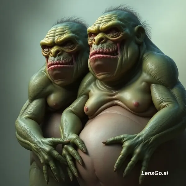 AI Image: Faça aparecer aparecer dois monstrinhos médios, gordos, verdes escuro, cheios de lipedemas pelos cor