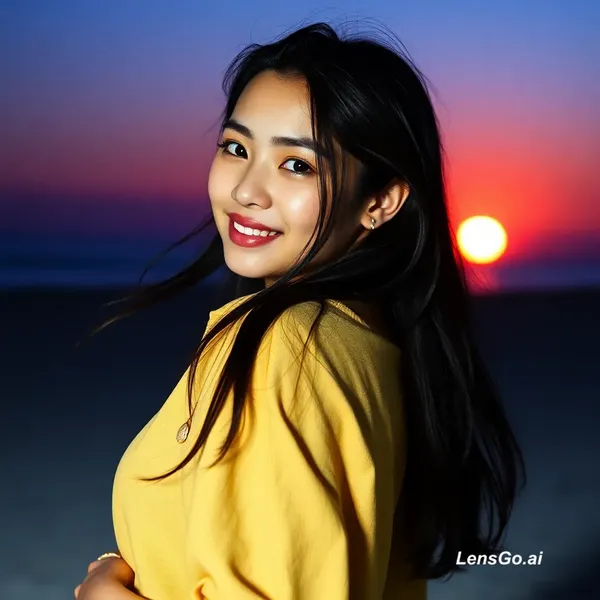 Use the reference photo of the girl. Create a beach night photo where she is standing with her back to the camera and turning her head toward the camera. Flash photography style. Her face looks glowing and slightly glittery with a sun-kissed look. She is wearing a light yellow loose linen shirt, half open, sleeves rolled up, and a small gold seashell necklace. Her long black hair is windswept with natural surfer vibes. In the background there is a beach sunset where the sun is almost set (98%), creating a deep purple and red sky. The photo is cropped above the waist with a strong flash lighting effect and cinematic beach aesthetic. High detail, realistic, 1080p quality.