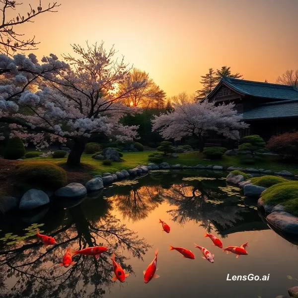 AI Image: A serene Japanese garden at golden hour, koi pond reflecting cherry blossoms