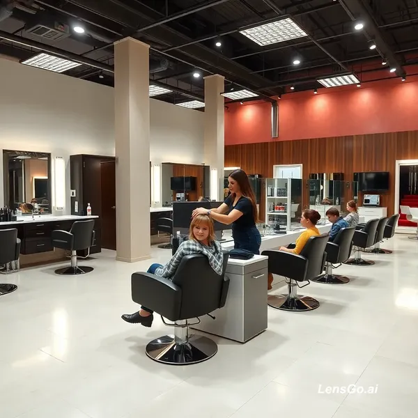 AI Image: I want an image of a very large hair salon with two shampoo stations, four styling stations, a recep