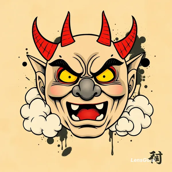 AI Image: The image features a stylized illustration of a Japanese hannya mask with exaggerated facial feature