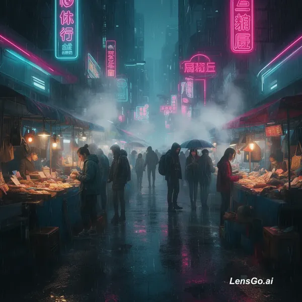 AI Image: Cyberpunk street market in the rain, neon signs and steam rising