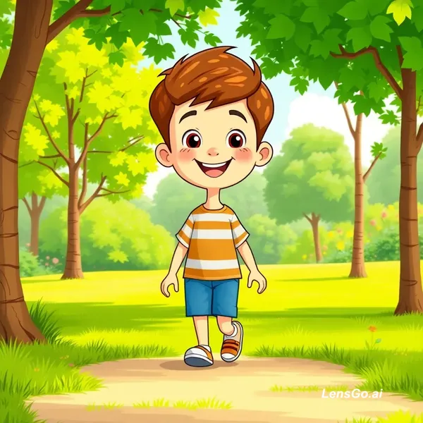 AI Image: A happy cartoon boy named Leo walking alone in a bright green park, sunny day, colorful kids animati