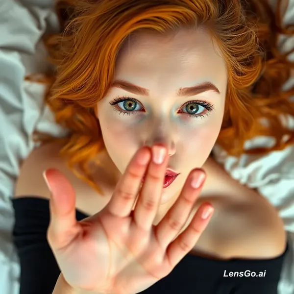 Extreme close-up portrait photograph of a young woman with vibrant, rich auburn-red wavy hair with a precise center part, lying down and looking directly into the lens. She is making a playful kissing face (pouting lips) while her hand is open, palm up, in the immediate foreground, miming blowing a kiss towards the viewer. The perspective is a slight high-angle (plongée), creating dynamic depth between the sharp hand and her face. She has light hazel-green eyes with subtle makeup and natural brows. The lighting is soft, diffuse ring lighting, creating subtle circular catchlights in her eyes and flawless, natural skin texture. She wears a simple off-the-shoulder black top. The background is a soft-focus (heavy bokeh) setting of rumpled white bedding and pillows, suggesting an intimate bedroom environment. Shot on a full-frame camera (e.g., Canon EOS R5) with an 85mm f/1.8 lens. Aperture f/2.2 for shallow depth of field, Shutter Speed 1/250s, ISO 640. Grainy, candid, high-resolution film quality, photorealistic, 8k.
