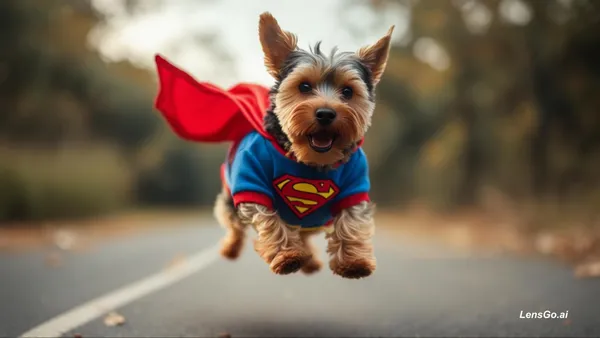 AI Image: dog flying in superman dress, shot on modular 8K digital cinema camera, standard prime lens, 35mm st