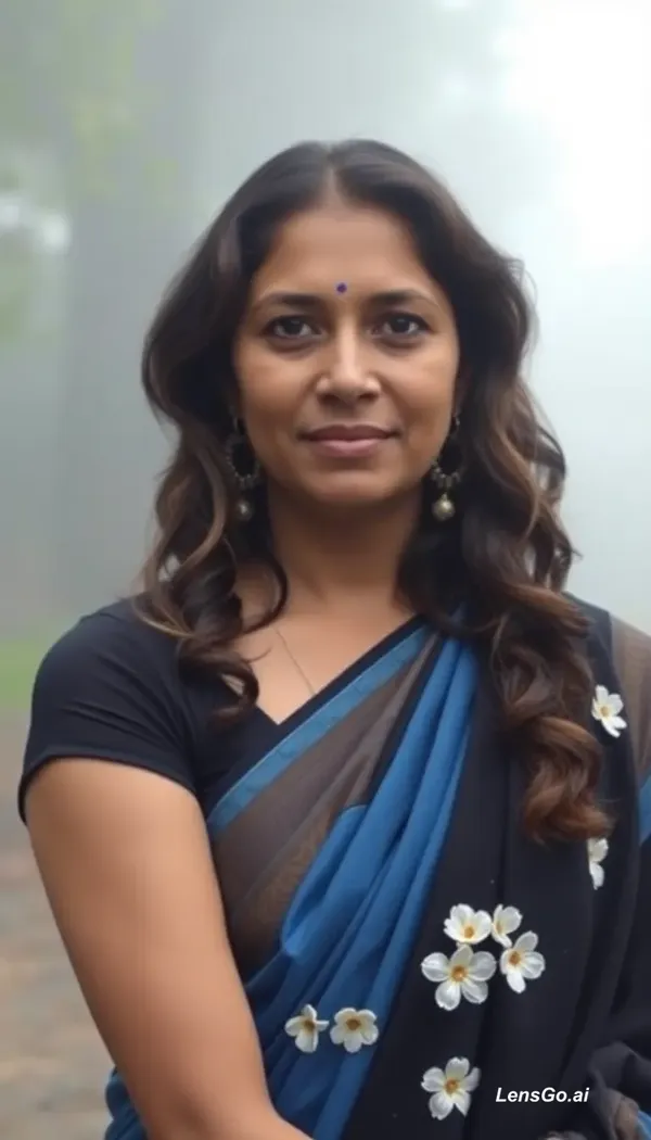 A white Indian woman, 32 years old, with brown wavy hair, wearing a blue and black sari with white flowers , with earrings , in a foggy environment