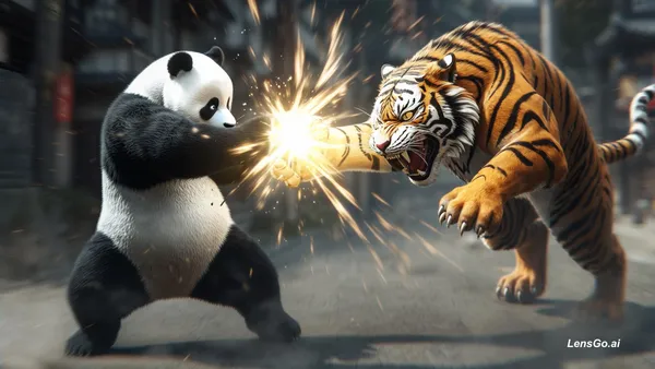 haz una pelea épico estilo anime con un panda que usa la expansión de dominó de Satoru cojo y un tigre en 2 patas peleando contra el panda mientras lanza ondas de energía desde sus manos, shot on modular 8K digital cinema camera, standard prime lens, 35mm standard natural perspective, f/1.4 shallow depth of field, creamy bokeh, professional cinematography, ultra-detailed, 8K resolution, film grain, cinematic color grading