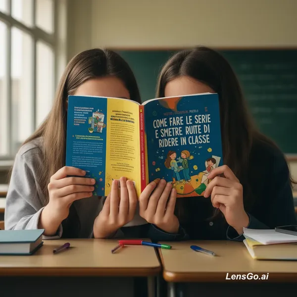 A realistic photo of two teenage girls sitting at a school desk. They are holding a book open in front of their faces to hide them, as if they are reading. The book cover is clearly visible and features the Italian text: "Come fare le serie e smettere di ridere in classe". Natural classroom lighting, cinematic style, high detail.