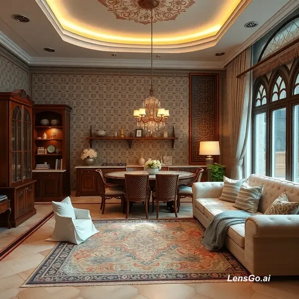 AI Image: Ek khoobsurat Islamic andaz mein saja hua ghar. Kamray mein narm sunahri aur sabz roshni, deewaron p