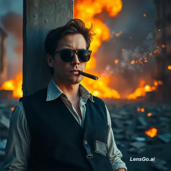 A cinematic slow-motion video of a serious man wearing a black vest, white dirty shirt and sunglasses, leaning against a broken concrete pillar in a burning city. He is smoking a cigar calmly while fire and explosions burn in the background. Sparks and embers floating in the air. Dramatic orange and blue lighting, intense atmosphere. The camera slowly pushes in toward his face, slight wind moving his hair and shirt. Fire flickering behind him, smoke moving naturally. Ultra-realistic, 4K, shallow