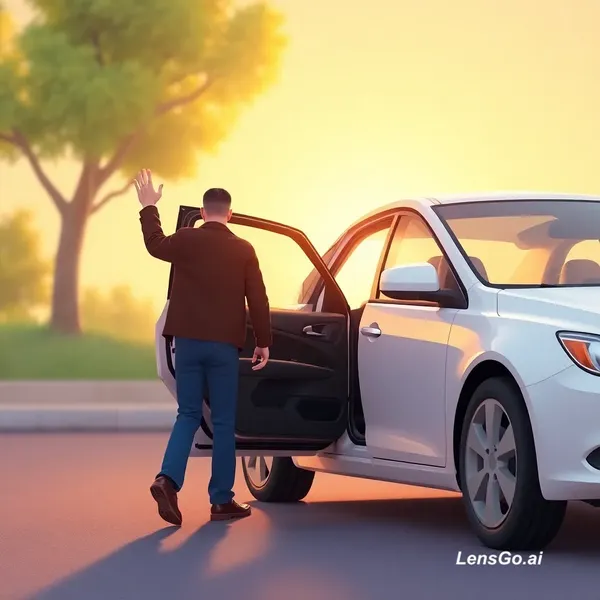 AI Image: create an animation where the man walks to the car, opens the door, and waves goodbye.