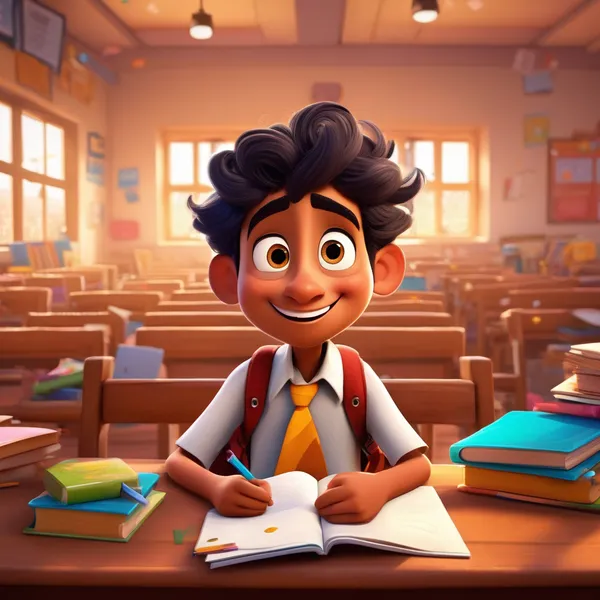 A funny Indian school student cartoon character in Pixar animation style, sitting on the last bench of a classroom, messy hair, expressive big eyes, loose school uniform, playful smile, holding a notebook full of doodles, colorful Indian classroom background, soft lighting, cinematic depth, 3D Pixar-style character design, high quality, vibrant colors, joyful comedy mood