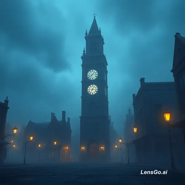 AI Image: “Foggy haunted town at dusk, giant ancient clock tower in center, broken buildings, dim yellow stree