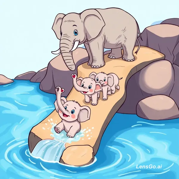 AI Image: "A vibrant cartoon of a happy elephant family crossing a river using a natural waterslide. The famil