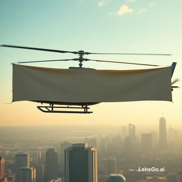5 second video of a helicopter flying sideways in the sky over a city. A simple horizontal banner is hanging under the helicopter with cables. The banner is fully rolled and closed like a scroll and facing the camera from the side. The helicopter moves smoothly while the banner gently swings in the wind. realistic cinematic lighting.