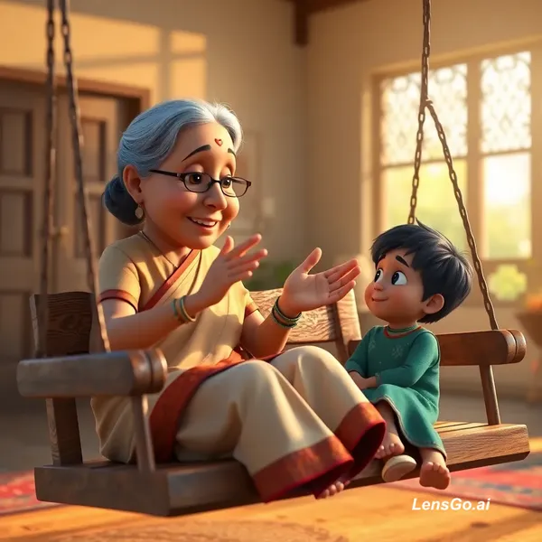 AI Image: "An emotional 3D animation of an Indian grandmother sitting on a wooden swing (jhoola) with her litt