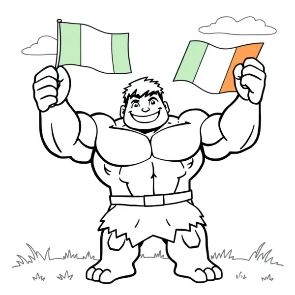 A simple black and white coloring page for kids of a big friendly superhero similar to Hulk, smiling and holding an Irish flag high in the air in one hand. The character should look strong but cartoonish and kid-friendly, with big muscles and a happy face. Clean bold outlines, minimal details, no shading, designed for easy coloring. The Irish flag waving proudly. Background simple with a few clouds and grass. Coloring book style, line art only, white background.