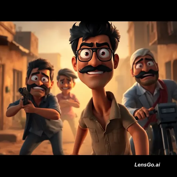 AI Image: 3D animated Indian comedy gangster movie, cinematic lighting, dramatic shadows, expressive cartoon c
