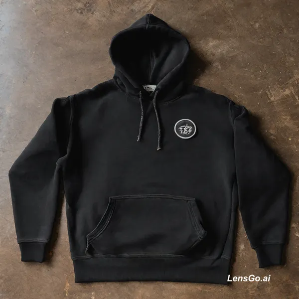Full front flat lay view, garment spread neatly face-up from collar to hem, all buttons, pockets and design details visible of ZUNARE "Arch Logo Heavyweight Hoodie" streetwear piece. Color: Washed Black. Material: 400gsm French Terry Cotton. Features: oversized fit, embroidered arch logo, kangaroo pocket, ribbed cuffs, dropped shoulders. Surface: warm organic textured linen/cotton cloth surface with natural woven grain and subtle fabric creases - NOT a plain white background, NOT a seamless paper backdrop - the surface is tactile, warm-toned, photorealistic textile backdrop. Lighting: soft natural directional light from upper left, gentle shadow falling to right, warm daylight tone, no harsh highlights. ultra-realistic 8K product photography, 2K resolution output, razor-sharp focus, Canon EOS R5, 100mm macro lens, f/8, ISO 100, zero noise, zero grain, color-accurate white balance, no human model, no face, no skin. Fabric: fabric texture hyper-detailed, thread count visible, material weight and drape photorealistic, ultra-premium streetwear brand quality. Brand: a woven ZUNARE label tag clearly visible - dark rectangular woven label with "ZUNARE" in clean uppercase serif - sewn at collar/inner seam, photorealistic and three-dimensional. -no watermark, no text overlay, no props-