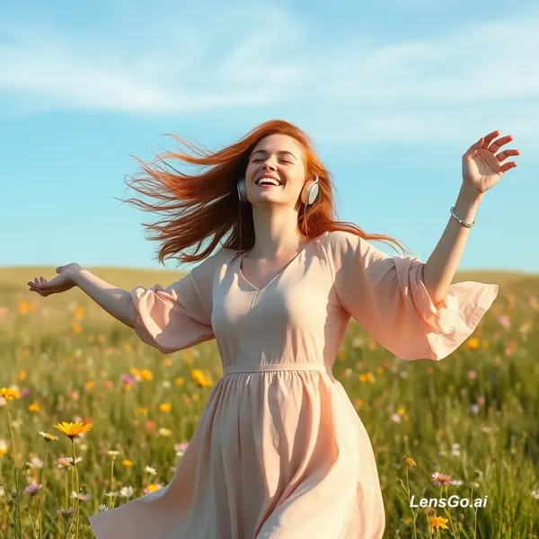 A joyful red-haired woman dancing freely in a flower-filled meadow under a clear blue sky, wearing flowing light dress and wireless headphones, her eyes closed, smiling, hair and fabric moving in the wind, dreamy natural light, soft focus, ethereal mood, wildflowers all around, sense of freedom and presence