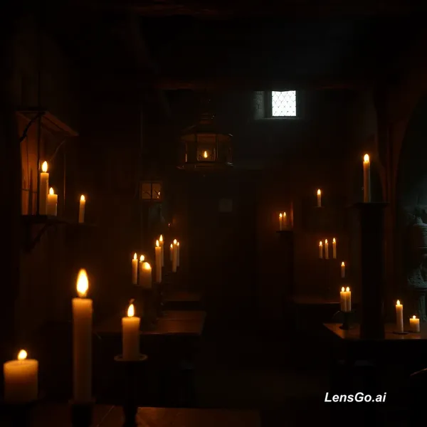 AI Image: medieval tavern ambience, candle flames gently flickering, warm light softly pulsing, mostly still s