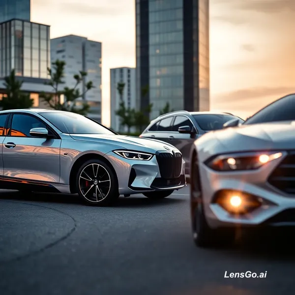 A photorealistic scene featuring a 2025 BMW i5 electric luxury sedan and a 2025 Mercedes-Benz E-Class luxury sedan parked side by side, modern urban background, premium lighting, cinematic angle, detailed reflections on car bodies, high resolution car photography style, sleek and elegant design, studio quality” ✅ Optional Add-Ons (add at end for specific style): • “sunset lighting” – dramatic warm light • “on a coastal road” – scenic background • “dynamic perspective from front three-quarters” –