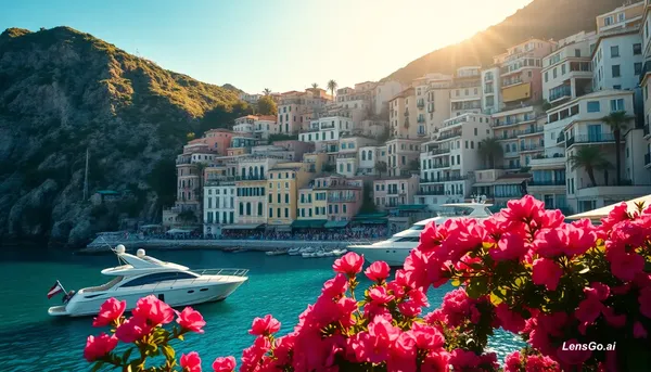 Positano colorful cliffside village on the Amalfi Coast, pastel buildings cascading to the Mediterranean, luxury yacht in turquoise bay, bougainvillea flowers, golden afternoon light, Italian summer vibes, travel magazine cover