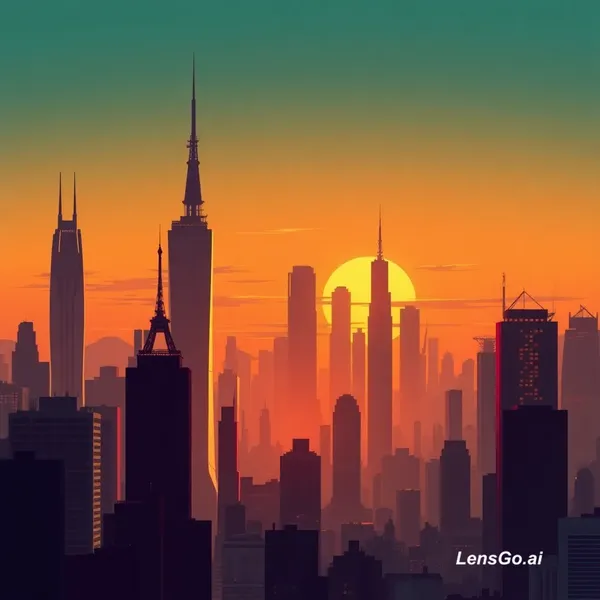 AI Image: Art deco poster of a futuristic city skyline at sunset