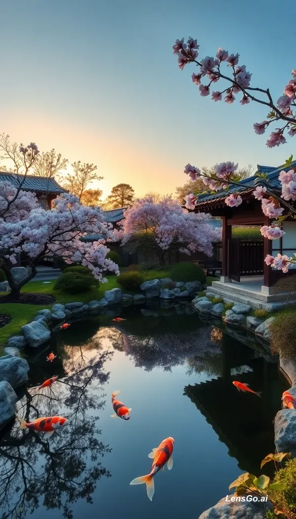 A serene Japanese garden at golden hour, koi pond reflecting cherry blossoms