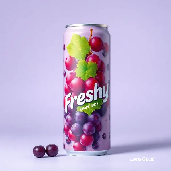 AI Image: Standard 330ml can of Freshy Grape Juice, vibrant red grapes as central focus, exuding youth and mod