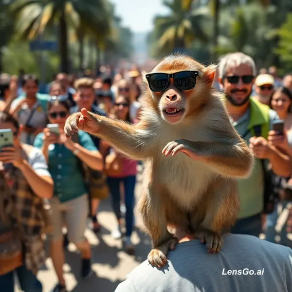 A mischievous monkey in a crowded tourist park during bright daylight suddenly jumps onto a man's shoulder, quickly grabs his sunglasses, and runs away through the crowd. The camera follows in smooth handheld motion (vertical 9:16). The monkey stops, wears the sunglasses, and starts posing like a celebrity-striking stylish poses, spinning, and doing funny dance moves. Tourists in the background laugh, point, and record videos on their phones. The man looks shocked and confused. The monkey ends with a dramatic slow-motion pose facing the camera. Style & Settings: Ultra realistic, cinematic lighting, हास্যকর (funny) expressions, vibrant colors, shallow depth of field, slight motion blur, 4K quality, high detail, natural park ambience, cheerful background vibe. Camera: Portrait (9:16), close-up + tracking shots, slight zoom-ins for comedy effect.