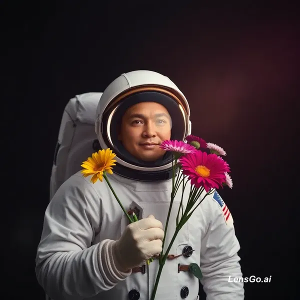 AI Image: Studio portrait of an astronaut holding flowers, dramatic lighting