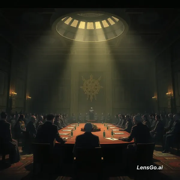 Anime cinematic scene, large hunter association hall, serious council meeting, dark lighting, dramatic shadows, leaders discussing forbidden continent Umbra, tense atmosphere, cinematic camera zoom, high detail, Hunter x Hunter style
