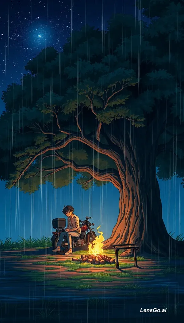 anime boy sitting under a big tree at night, motorcycle parked beside him, small campfire burning, fire sparks flying, gentle rain falling, leaves moving in the wind, starry sky, peaceful relaxing atmosphere, cinematic lighting, anime style, highly detailed, aesthetic anime scene
