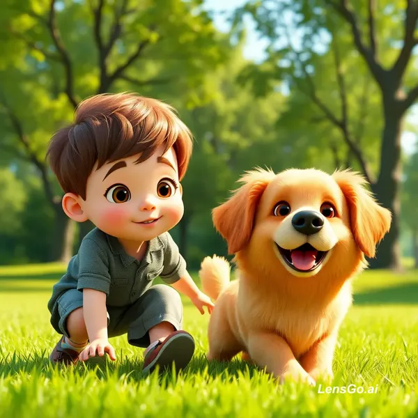 "A cute 3D Pixar-style animation of a little boy and his fluffy golden retriever playing in a sunny green park. Bright colors, expressive faces, high detail, 4k, smooth cinematic movement."