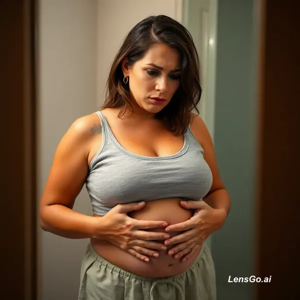 Brazilian woman, 38 years old, natural look, no makeup, slightly tired expression, looking at herself in the mirror touching her belly with frustration, indoor bathroom, soft natural lighting, realistic photo, not staged, relatable moment, feeling bloated and uncomfortable, lifestyle photography, candid, iphone style
