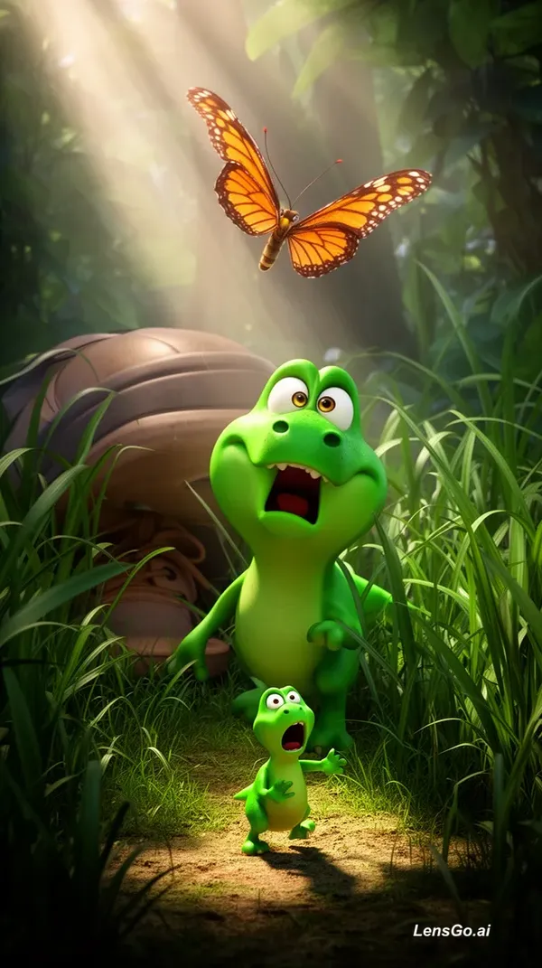 🎬 SCENE 2 — Giant World Shock Prompt: A funny-looking bright green cartoon T-Rex named Rex, with big expressive eyes, tiny arms, oversized head, and goofy playful face, now extremely small, standing in a massive jungle where grass blades look like giant trees, Rex is a talkative expressive character reacting in shock, looking up with wide eyes and open mouth, oversized butterfly hovering above, enormous human shoe in background, exaggerated scale perspective, sunlight rays shining through leaves, tiny Rex casting a small shadow, cinematic depth, whimsical humor, ultra-detailed environment, vibrant Pixar-style 3D, Ultra-detailed 10K cinematic animation, volumetric lighting, depth of field, ultra-sharp focus, dramatic shadows, global illumination, highly detailed textures, soft cinematic glow, dynamic camera angles, shallow depth of field, expressive character, 8k–10k resolution, high contrast, cinematic storytelling, hyper-realistic environment, no text, no watermark